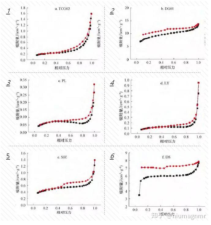 6组煤样的液氮吸/脱附曲线见图3。参照IUPAC的滞后环分类标准,图3a、图3c、图3d滞后环细小狭窄,表现为开放性透气孔;图3h和图3f吸/脱附曲线相对平行,没有产生吸附回线,表现为一端封闭的不透气孔;图3e滞后环相对宽缓,表现为细颈广体的墨水瓶孔。