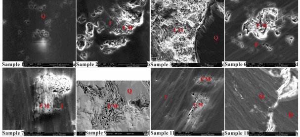 矿物组分和沉积成分特征:砂砾岩以石英(44.3%)和长石(40.1%)为主,其次为粘土矿物(10.3%),见表1。通过铸体薄片分析得知砂砾岩沉积碎屑颗粒以岩石碎屑(58.2%)为主,其次是长石碎屑(15.9%)和石英碎屑(12.3%)。颗粒分选性由中到差,圆度主要为近圆形和近棱角形。石英和长石碎屑越多,微米级孔隙越发育;火山岩碎屑、泥质基质和胶结物越多,微米级孔隙越不发育。