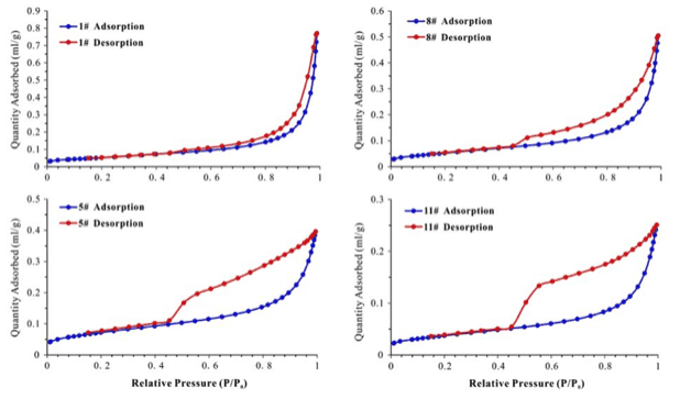 低温氮气吸附:砂砾岩氮气吸附/解吸等温线存在明显的滞后环,滞后环类型可以反映多孔介质的孔隙形态。砂砾岩样本的滞后环大致分为四种类型(见图3):样本1#、8#、5#和11#分别对应开缝孔、狭缝孔、墨水瓶孔和细颈宽体的墨水瓶孔。