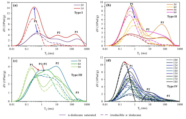 样本在So状态下的NMR T2 谱如图5实线所示。T2谱整体呈三峰结构,存在四种类型:类型I有三个连续峰,P1峰zui高,P2与P3较为接近;类型II有明显的P1和P3峰,P3峰左移;类型III有明显的P1和P2峰或P1+P2峰;类型IV P1峰幅值zui高,P2和P3峰均较小。
