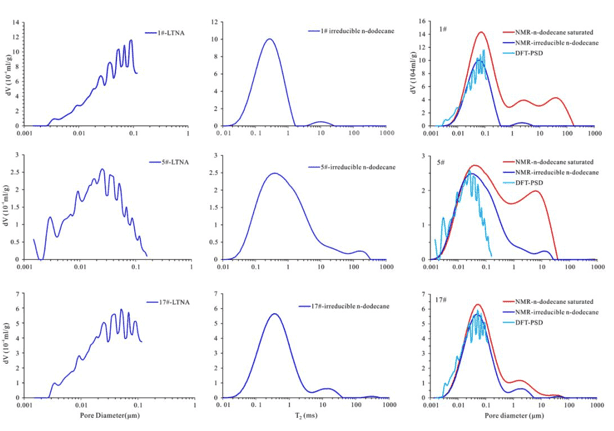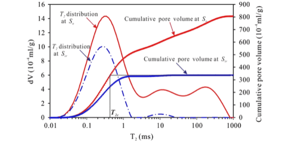 核磁共振 T2 谱:本文测试了样本在三种状态下的核磁共振 T2 谱:(1)洗油并110℃干燥后;(2)正十二烷饱和-So;(3)正十二烷离心-Soir。洗油干燥样本的 T2 谱代表岩石颗粒表面的束缚水和粘土层间紧密结合的羟基水。So和Soir状态下的 T2 谱需要减去干燥样本的T2谱。
