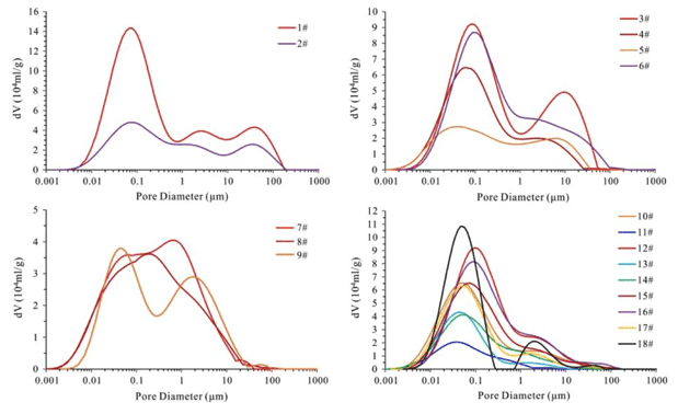 本文对18组砂砾岩样本进行了全尺度孔径分布表征和可动油分布和控制因素的定量化研究。有以下成果: