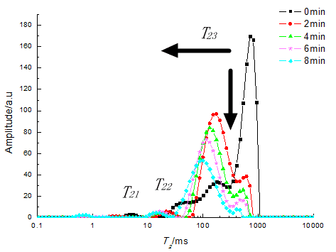 T21峰对应为蘑菇中与生物大分子以氢键紧密连接的水分,即结合水;T22峰对应细胞壁中存在的水分,为不易流动水;T23峰对应存在于细胞内以及细胞间的水分,为自由水。