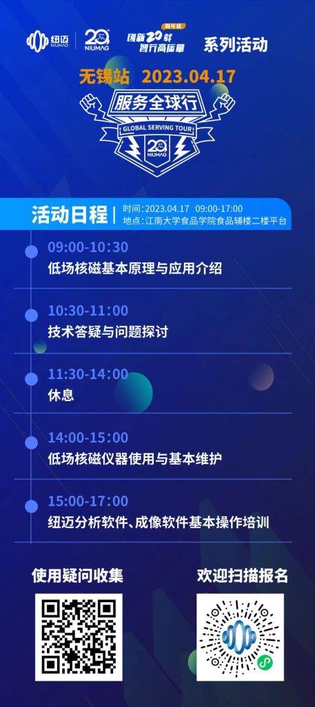 正是江南好风景,落花时节又逢君。纽迈分析第四届服务全球行2023年度活动第二站,4月17日(周一)与您相约江南大学,无锡站。大家在使用设备的过程中出现过哪些问题?可以填写使用疑问收集表,我们将会根据收集的问题来准备本次活动内容。 活动内容暂定如下,如有调整,我们会通过公众号发布最新日程。请大家持续关注纽迈分析公众号信息。