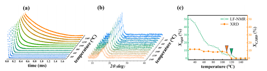 利用低场核磁的无损优势,对高结晶度 F2314 样品进行 30-150℃的升温原位测试,实时监测刚性链段含量(Xrigid)的变化。结果显示,结晶区晶格消失(XRD 信号消失)早于链段运动(LF-NMR 检测到刚性链段消失),清晰还原了熔融过程中 “晶格破坏 – 链段松弛” 的动态过程。