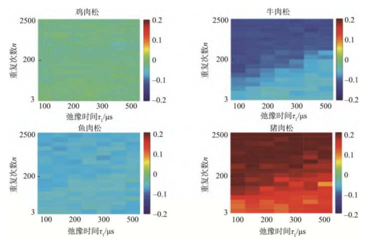 以 4 类纯肉松(猪、鸡、牛、鱼)的二维弛豫数据平均强度为基准,构建 “参考曲面fref(τ1,n)”(曲面函数含多阶多项式项,可精准表征纯肉松的弛豫特征);将待测样品的二维弛豫曲面与参考曲面相减,得到反映样品与纯肉松差异的 “τ2分布指纹谱”。