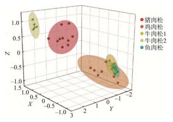 为提升准确性,将二维指纹谱数据整合到三维坐标系(X、Y、Z 分别代表指纹谱的 3 个特征区域),并构建置信度 60% 的 “置信椭球”:不同种类肉松的数据点在三维坐标系中呈特定分布(如猪肉松集中于上部左侧、鸡肉松集中于下部右侧),且混合肉松的数据点会沿 “纯肉松 – 纯肉松” 的线性路径分布(如猪鸡混合肉松的线性拟合决定系数(R2=0.97186),可通过数据点位置进一步验证种类及掺假比例,确保检测精确性。