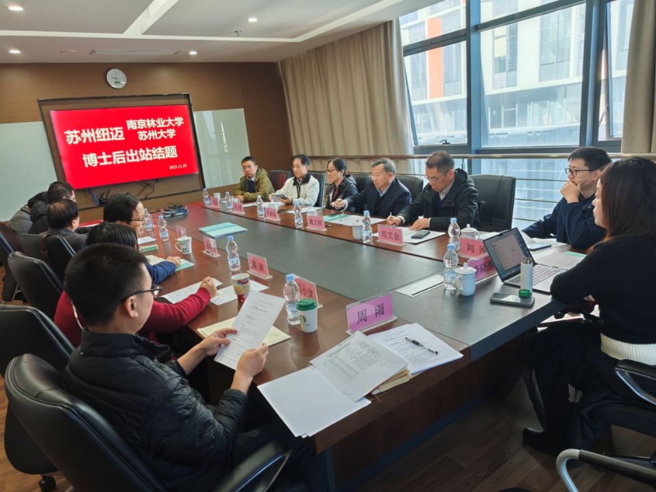 本次结题答辩会的评审组由南京林业大学李淑娴教授(博导)担任组长,受邀评审专家包括苏州大学魏文祥教授、苏州农业职业技术学院司文会教授、苏州大学邓益斌教授、台湾工业技术研究院吴永豪研究员;政府部门代表方面,苏州高新区人社局和浒墅关科创局有关部门负责人出席了会议。苏州纽迈除杨培强董事长和燕军教授外,在站博士后安永博士和昝悦博士,以及纽迈相关同事也共同参与了本次结题会。