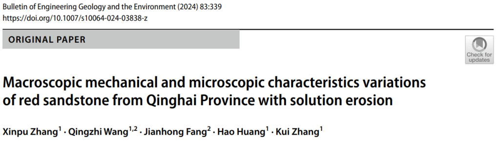 [1] Zhang X, Wang Q, Fang J, et al. Macroscopic mechanical and microscopic characteristics variations of red sandstone from Qinghai Province with solution erosion[J]. Bulletin of Engineering Geology and the Environment, 2024, 83(8):1-18.DOI:10.1007/s10064-024-03838-z.