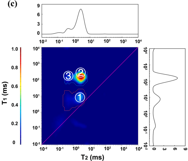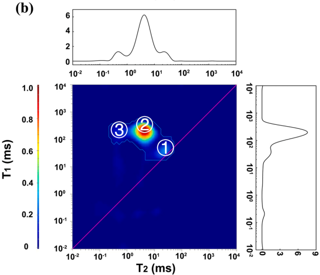 二维T1-T2 NMR:进一步分离重叠的组分,使得在复杂体系中也能准确识别不同含氢组分的弛豫时间特征。