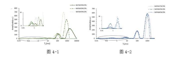 WPI、HS和卡拉胶形成的乳液横向弛豫时间(T2)图谱如图4-1、4-2、4-3、4-4所示。
