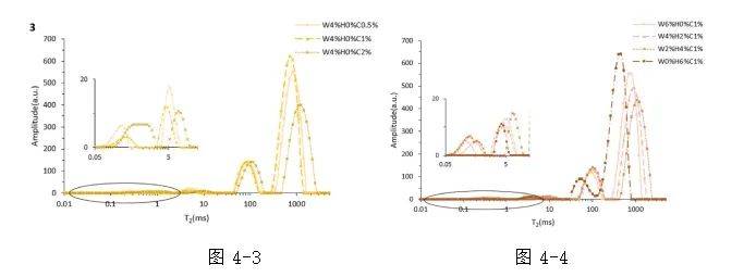 根据2%、4%和6%单组份乳化剂悬浮液T2衰减曲线,得到T2W和Tcur。随着浓度从2%增加到6%, T2w 和 Tcur 减小,意味着更快的衰减过程和对氢质子的结合力更大。说明通过增加乳化剂浓度影响其分子内或分子间相互作用,从而增加其与氢质子的结合能力。