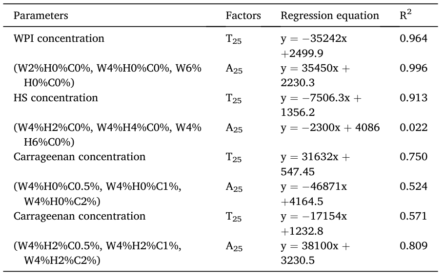 通过分析WPI、HS 和卡拉胶悬浮液浓度与弛豫结果的相关性,如图3,T25为游离水氢质子,A25为总氢质子, WPI、HS和卡拉胶浓度与T25和A25呈现线性关系。